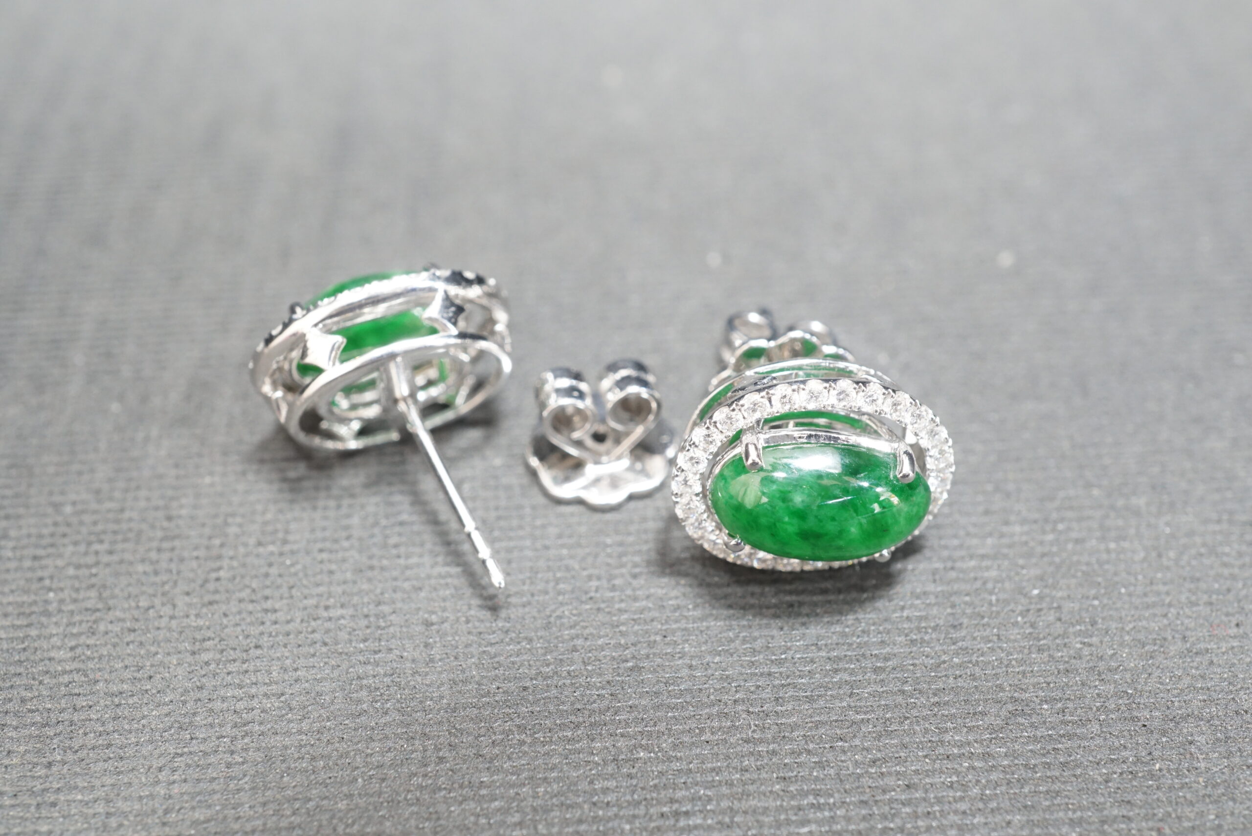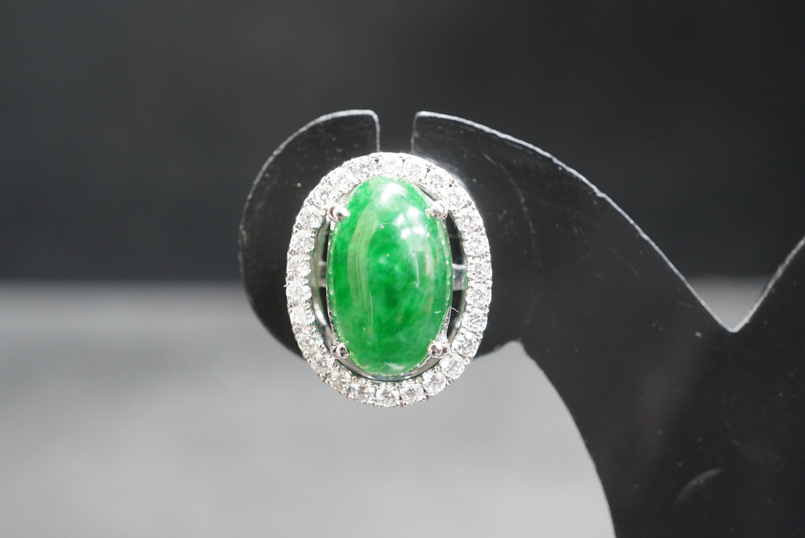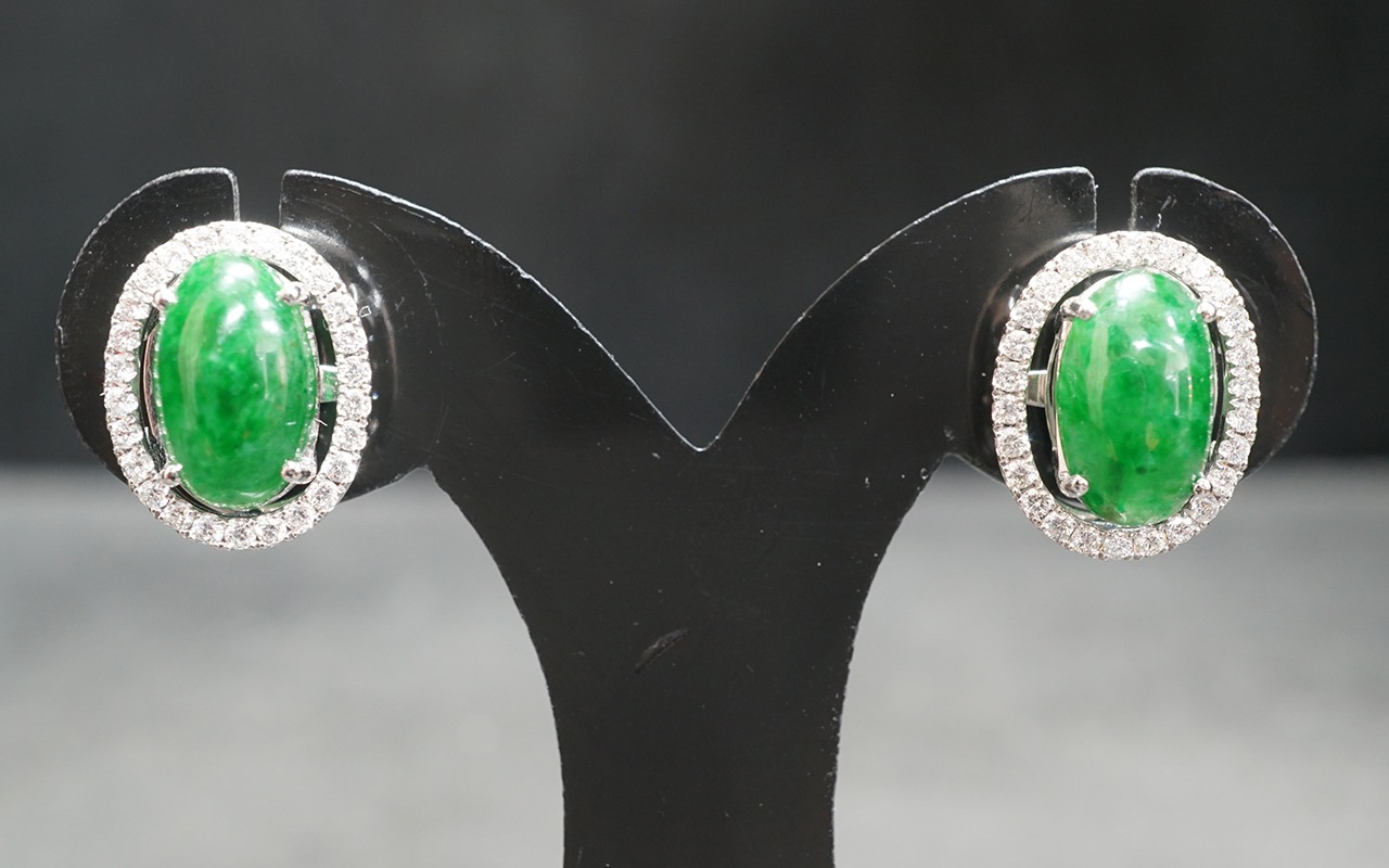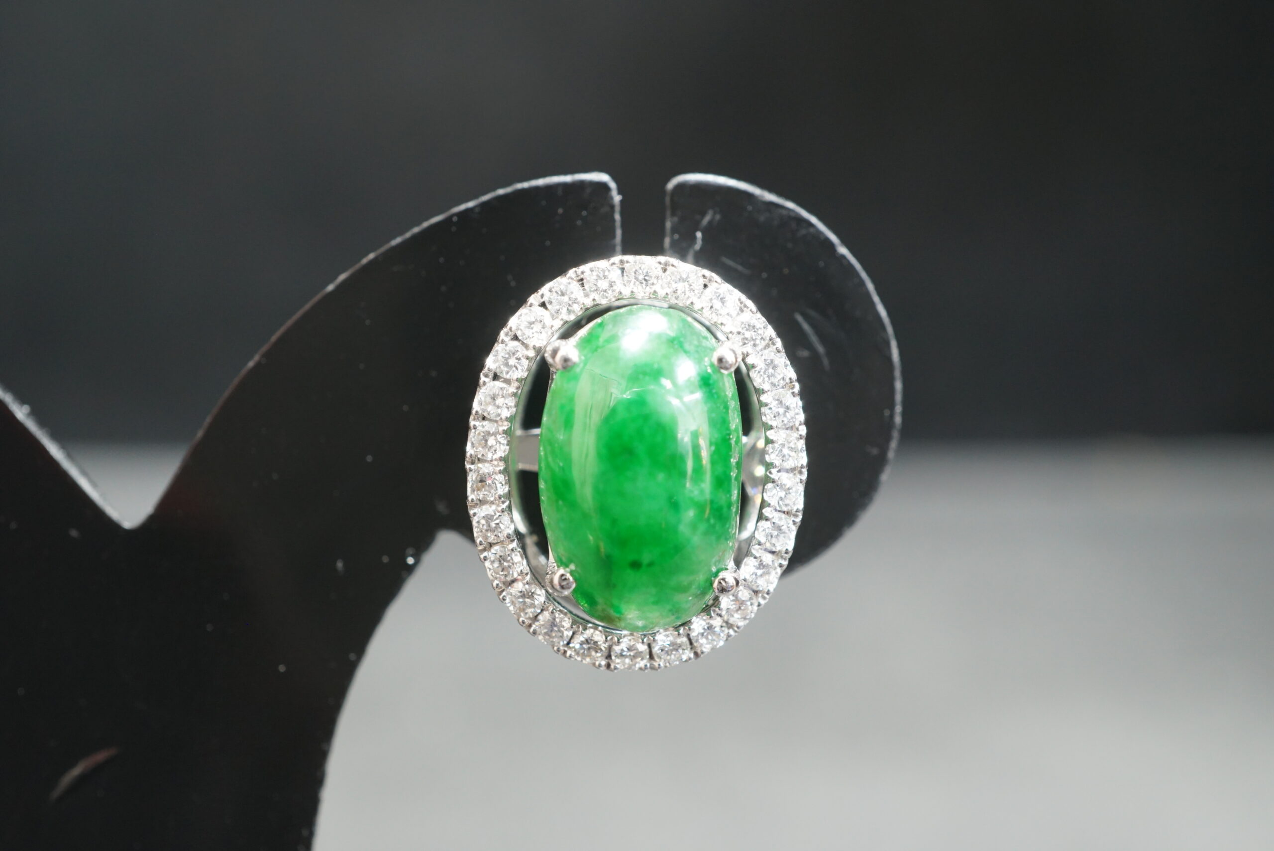 ต่างหูหยกประดับเพชร ประดับหยกไซส์2.44ct. , 2.33ct. ประดับเพชร 52 เม็ด น้ำหนักเพชรโดยประมาณ0.50ct. น้ำหนักชั่งรวมทั้งชิ้น7.1g. ตัวเรือนทองคำขาว90% ขนาดความกว้าง.1.2cm. สูง.1.5cm.